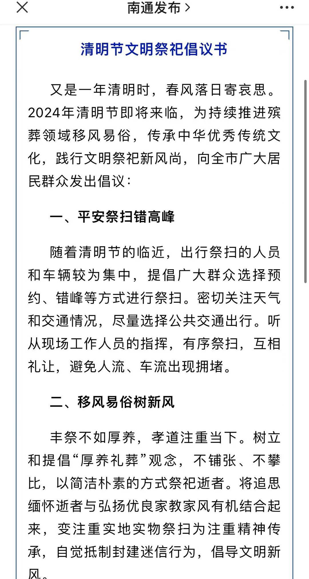 除开这个通告之外,南通市民政局还联合当地精神文明建设办公室发布了《清明节文明祭祀倡议书》,提到要“树立和提倡‘厚养礼葬’观念,不铺张、不攀比,以简洁朴素的方式祭祀逝者”,“采用鲜花祭扫、植树缅怀、书写寄语、网络追忆等绿色环保方式祭奠先人、感念先辈”。