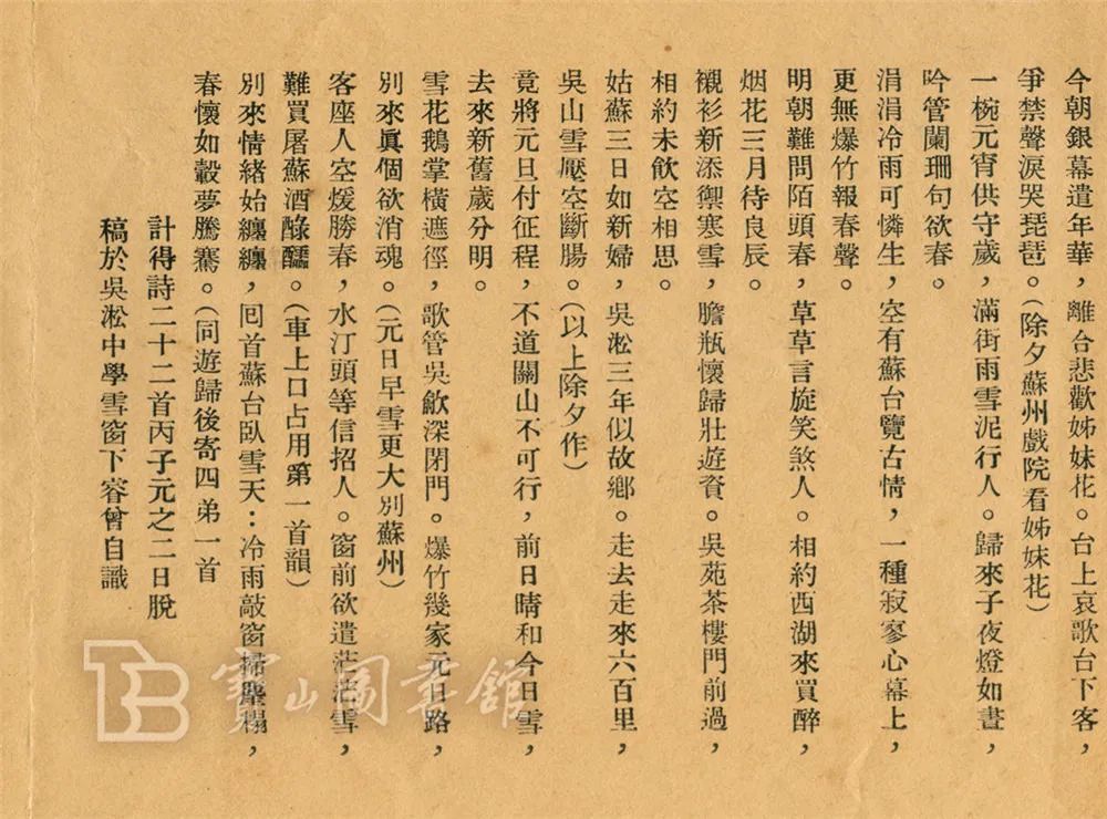 1936年春节刚过,1月25日,大年初二。窗外下着皑皑的大雪,校园里那几幢简朴的校舍,那几棵挺拔的松树,那一片空阔的操场,都铺上了厚厚一层洁白的积雪。学生们早已离开校园,回到各自的家中与家人欢聚,只有睿曾与几位远来的老师留在了学校。前几天睿曾带着四弟去苏州守岁,归来后连夜写下二十二首诗词,今天在宿舍里改了又改,不知不觉,窗外暗了下来。她停下手中的笔,望着改定的诗稿,向合起的手掌吹了一口热气,顿时冰冷的手心有了些暖意。