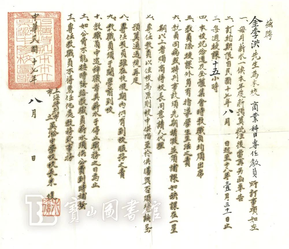 校长朱复签发教员金季洪(金克浩)聘书