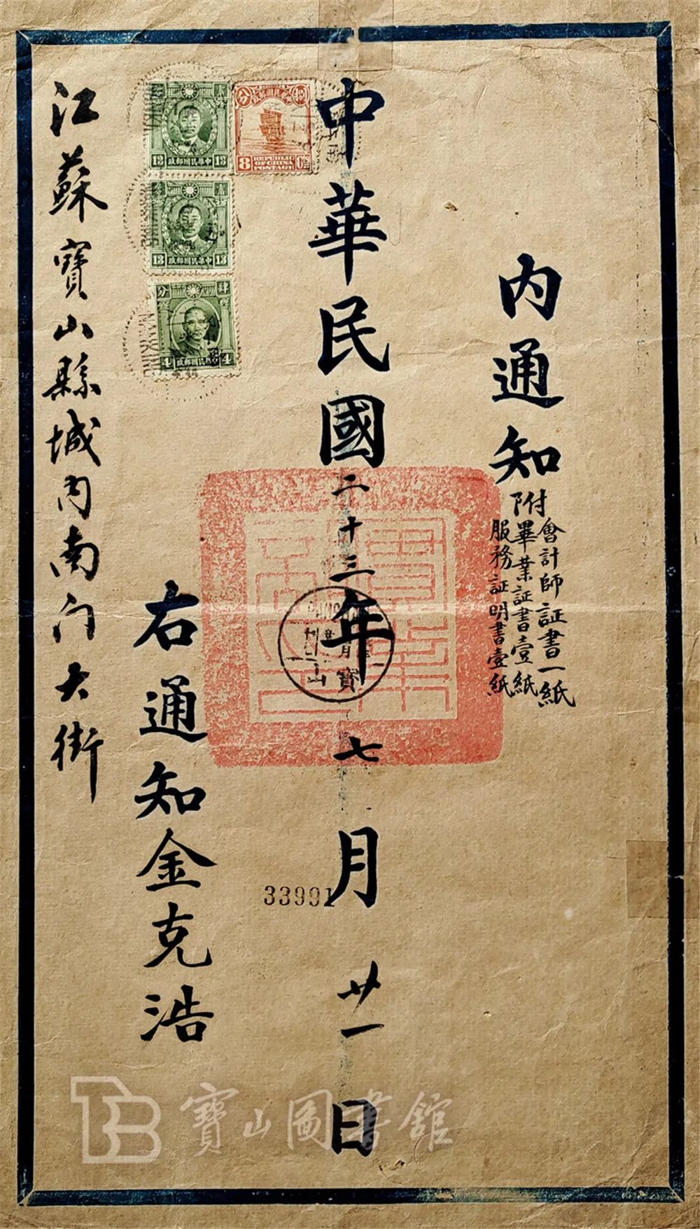 实业部致金克浩函信封(1934年7月21日)