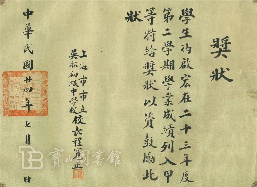 校长程宽正签发学生冯启宏奖状(1935年7月)