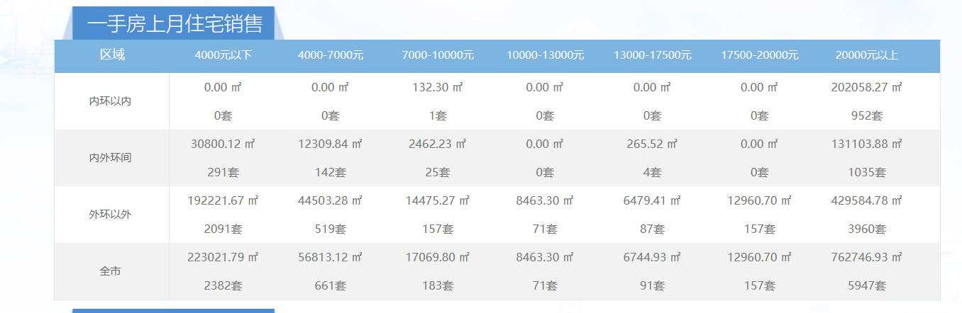 在该网站环间月度成交分析统计表中,记者也发现一手房上月住宅销售“4000元以下”均价成交主要集中在外环以外,内环以内成交0套,内外环间291套,外环以外2091套。