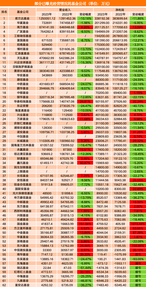 据澎湃新闻记者不完全统计,截至4月29日晚间,已有至少62家基金公司2023年营业收入和净利润的数据出炉。