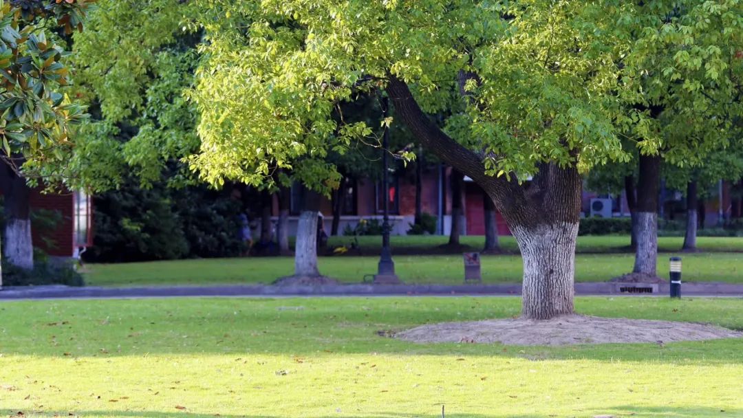 阳光、青草、笑语……踏入东华大学延安校区中山西路校门,第一眼就能望见古树环绕的中心广场、绿草茵茵的大草坪。