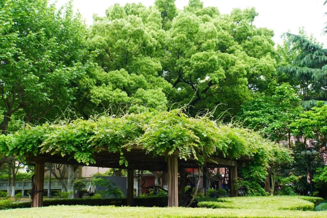 食堂门口一片怡人的小花园,四季如春。紫藤长廊、幽静小道、古风凉亭,无不诉说着校园生活的浪漫与惬意。