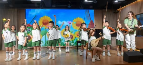 在上海市音乐幼儿园,小乐队正在为周五去附近的格致中学而欢快地排练着。“顶顶顶,顶呱呱,顶顶顶,顶呱呱,一帆风顺金榜题名,哥哥姐姐一定行!”歌词简单直白,小乐手和小主唱有模有样。