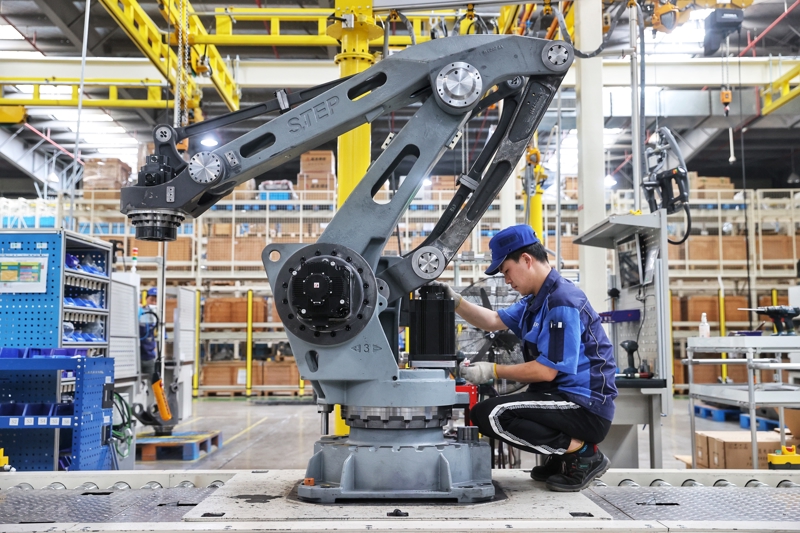 上海新时达机器人有限公司机器人装配车间,工人正在装配一台机器人。赖鑫琳摄