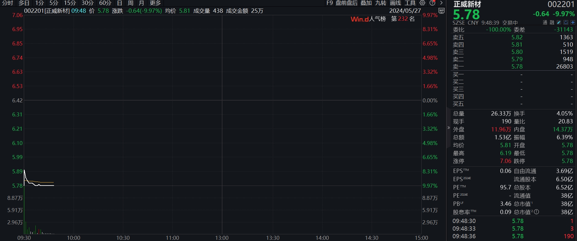 5月27日,正威新材开盘跌停,盘中一度打开跌停板,截至发稿,该股再度封跌停。