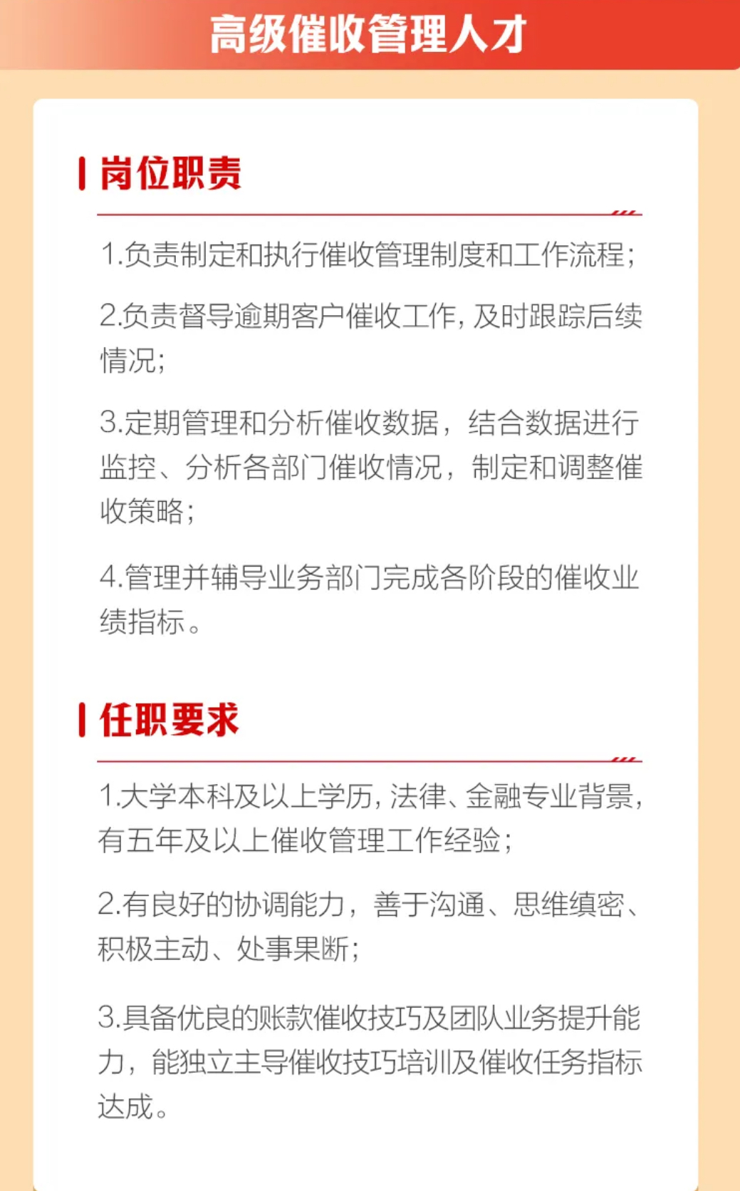 公告显示,高级催收管理人才将负责制定和执行催收管理制度和工作流程,督导逾期客户催收工作,及时跟踪后续情况,同时定期管理和分析催收数据,结合数据进行监控、分析各部门催收情况,制定和调整催收策略,管理并辅导业务部门完成各阶段的催收业绩指标。