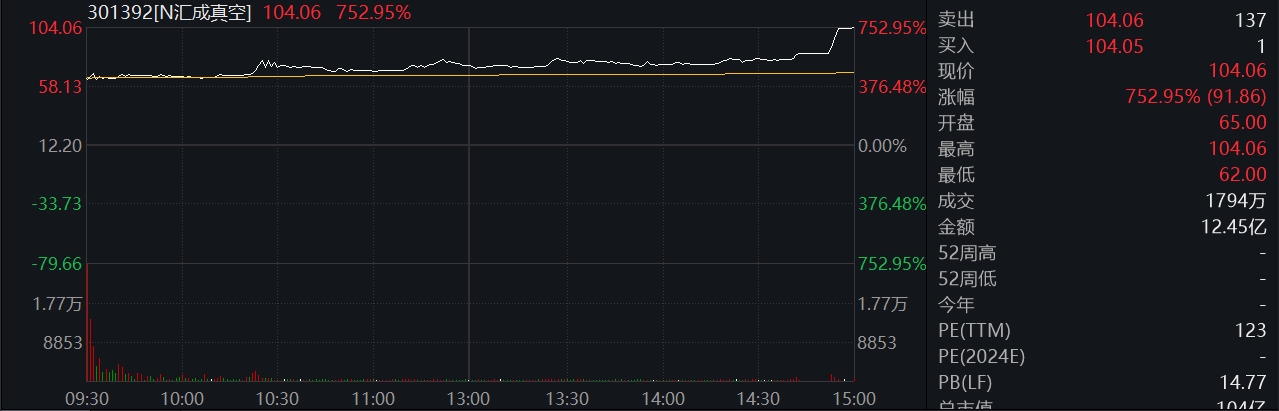首日收涨752.95%,盘中两度临停!汇成真空成今年最强新股