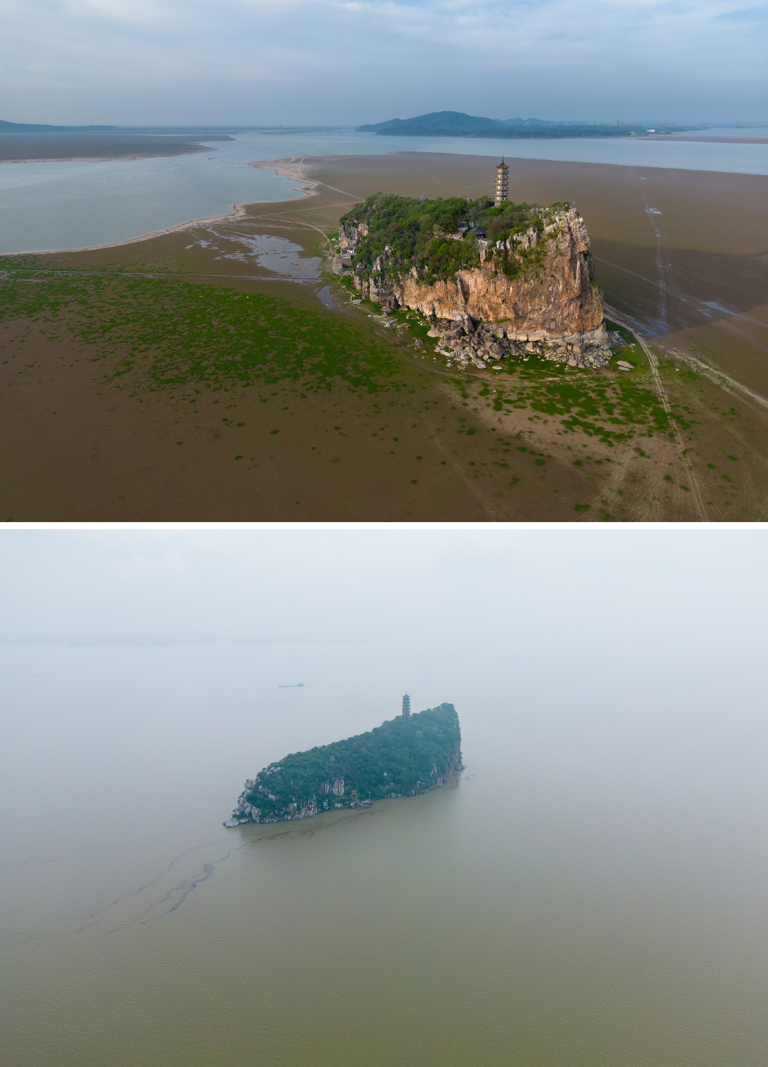 上图:2024年3月30日,江西九江,鞋山矗立在干枯的湖滩上。