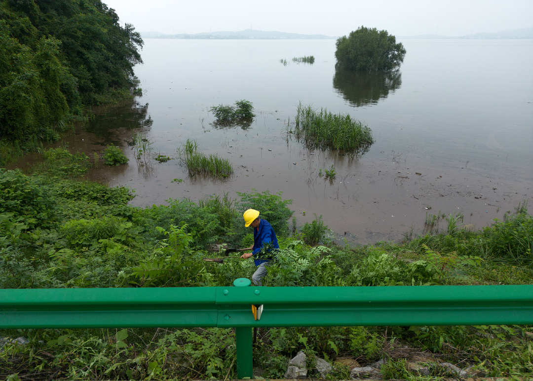 2024年6月26日,江西九江,濂溪区开天村村民在清除鄱阳湖坝体杂草。