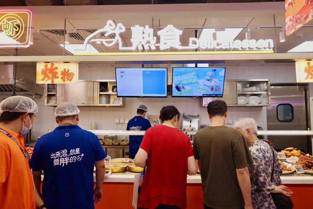 考虑到周边以白领和上班族为主的人群特性,盒马传媒港花园里店特别调整了商品结构,以满足快节奏生活中的各种需求。店内餐饮区占据显著位置,不仅提供了丰富的中式快餐如烧腊饭、淮南牛肉汤,还有西式简餐、日料等,确保市民能在午休时间找到心仪的美食,享受美味的工作餐。