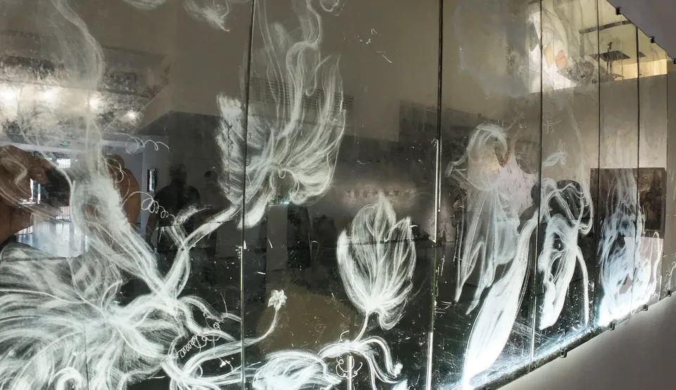 因此,由修复师转换身份成为艺术家后,陈笑之尝试用透亮且善于展现变化无尽的金箔、银箔,以“镜面反绘”的形式,打造属于自己的包容万象的“珍奇阁”。