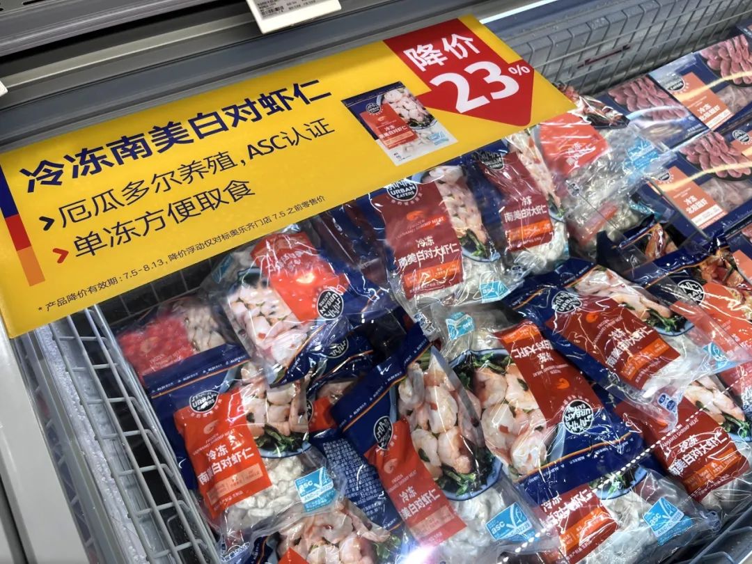 记者在现场看到,超市冷冻柜中整齐摆放着促销活动冻品。例如,源自厄瓜多尔瓜亚斯的南美白对虾仁,32.9元/份,该产品获得了ASC水产养殖管理委员会可持续认证,经由海水养殖,外观晶莹剔透,肉质紧实。