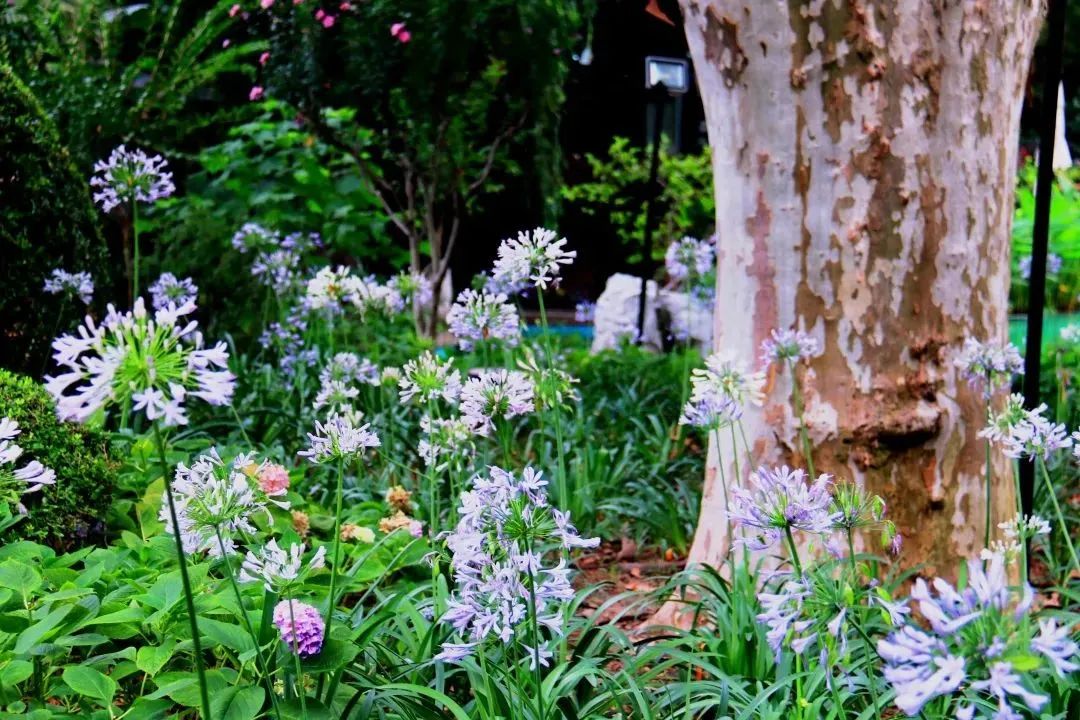 除了静安公园外,昌平路、幸福绿地,以及多个口袋公园都能找到百子莲那一抹清凉的蓝紫色踪影。