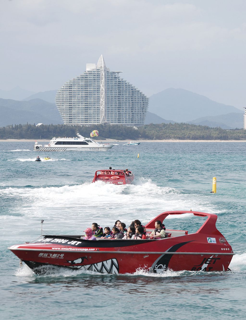 在海南省三亚市蜈支洲岛旅游区,游客体验动感飞艇项目。赵颖全 摄