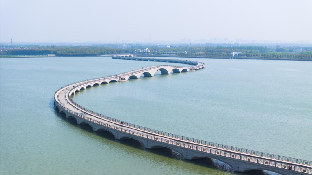沿着淀山湖东岸线行走,远远望去彩虹桥如一条丝带飘落在湖面,灵动优美,成为湖上一道亮丽的风景线。这座1.47公里长的慢行桥最大的看点之一在于:它的S形曲线,与青浦地图的蝴蝶造型相契合,寓意满满。