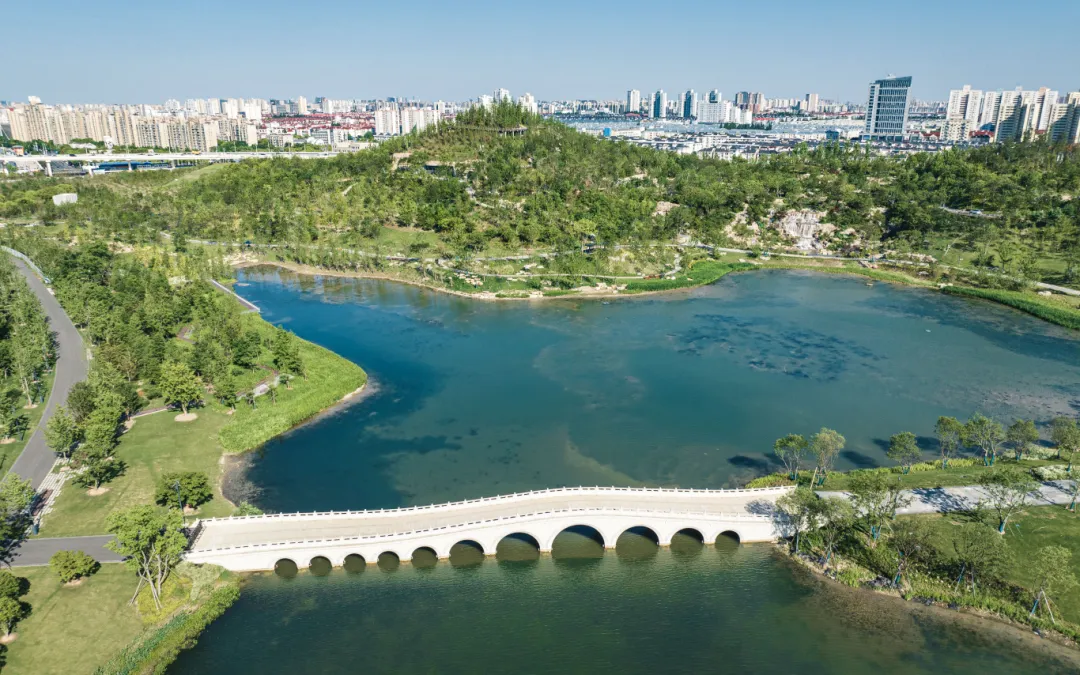 大草坪不远处的十一孔桥全长约75米,由大小渐变的7孔与大小相等的4孔组成。十一孔桥以传统中式园林石拱桥为基础,融入现代建造工艺。与双子山山峰起伏呼应,成为桥上赏园、园中赏桥的景观焦点。