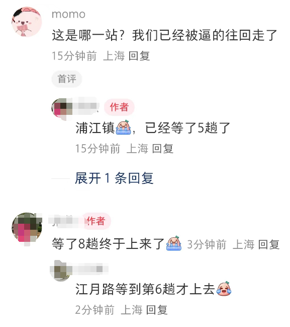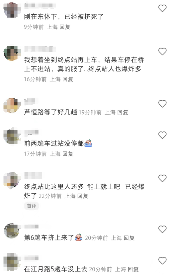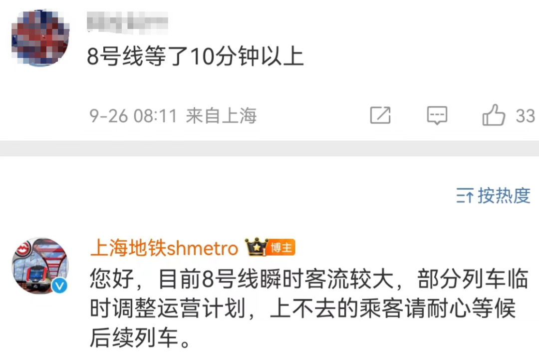 今天8时19分,@上海地铁shmetro在微博留言区回应:目前8号线瞬时客流较大,部分列车临时调整运营计划,上不去的乘客请耐心等候后续列车。