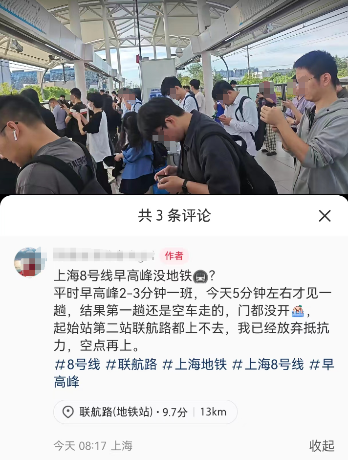 今日早高峰,上海地铁8号线“站台上人多到爆炸”!官方回应