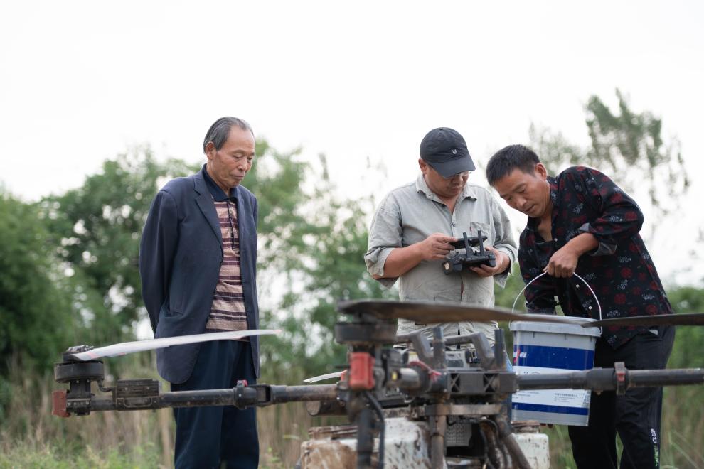 9月26日,小岗村村民使用植保无人机,严宏昌(左一)在一旁观看。