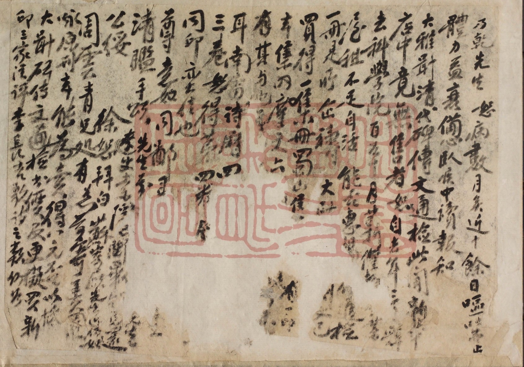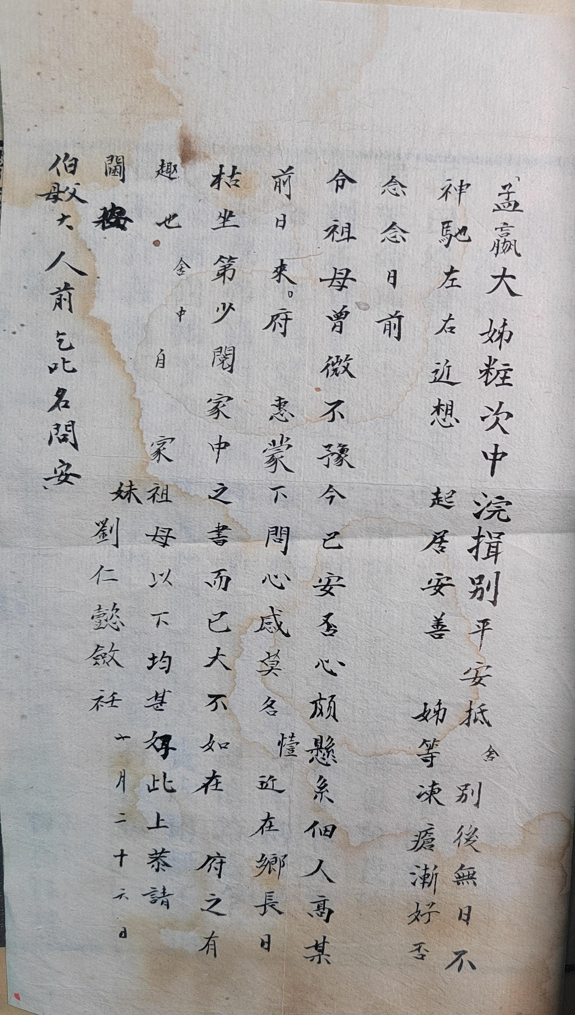 孟嬴大姊妆次:中浣作别,平安抵舍。别后无日不神驰左右,近想起居安善。姊等冻疮渐好否,念念。日前令祖母曾微不豫,今已安否,心颇悬系。佃人高某前日来,惠蒙下问,心感莫名。㦉近在乡,长日枯坐,第少阅家中之书而已,大不如在府之有趣也。舍中自家祖母以下均甚好。此上,恭请阃安。妹刘仁懿敛衽。十月二十六日。