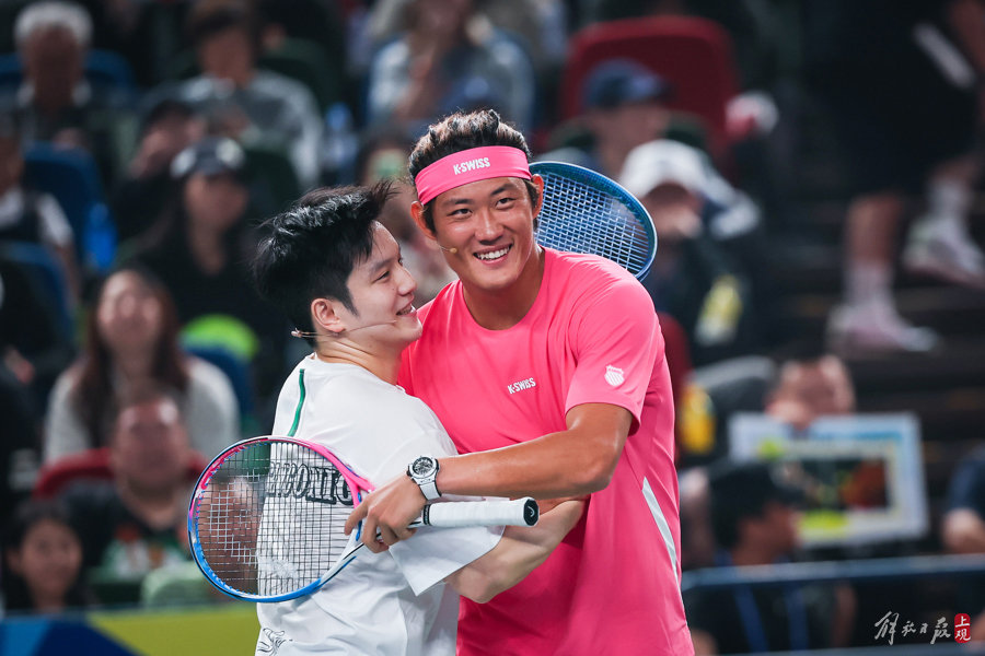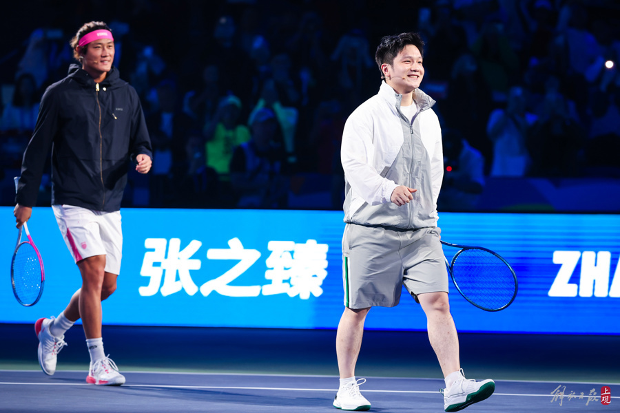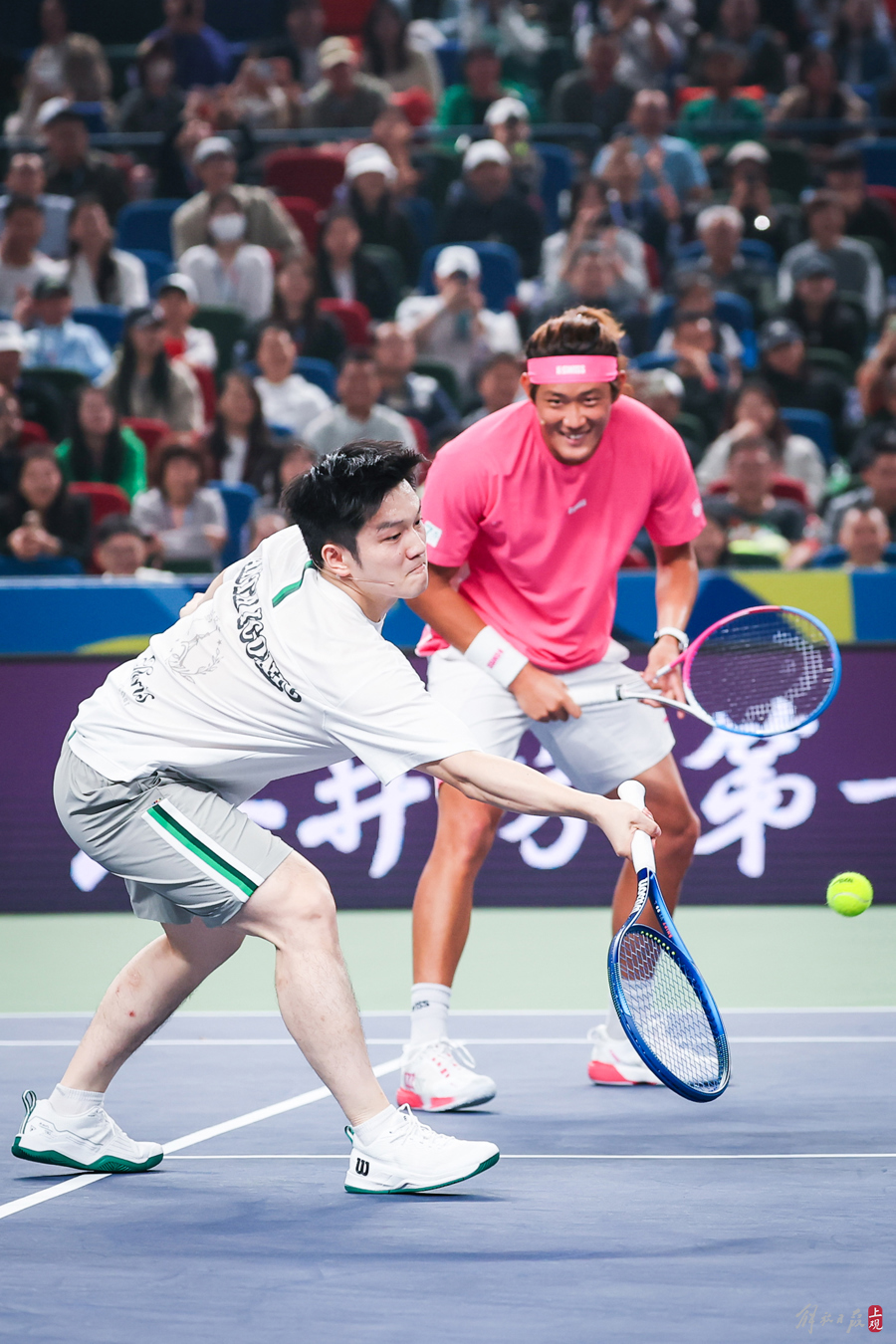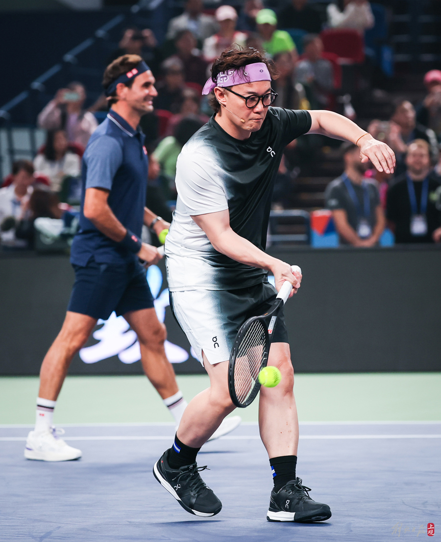 相比于陈奕迅,乒乓球奥运冠军、超级大满贯得主樊振东更是“网球新人”。在这场双打表演赛之前,樊振东突击进行了两个课时的训练,这是他第三次挥拍站上网球场。樊振东打趣说道“虽然是第三次打网球,但我已经站在了上海大师赛的中央球馆。”