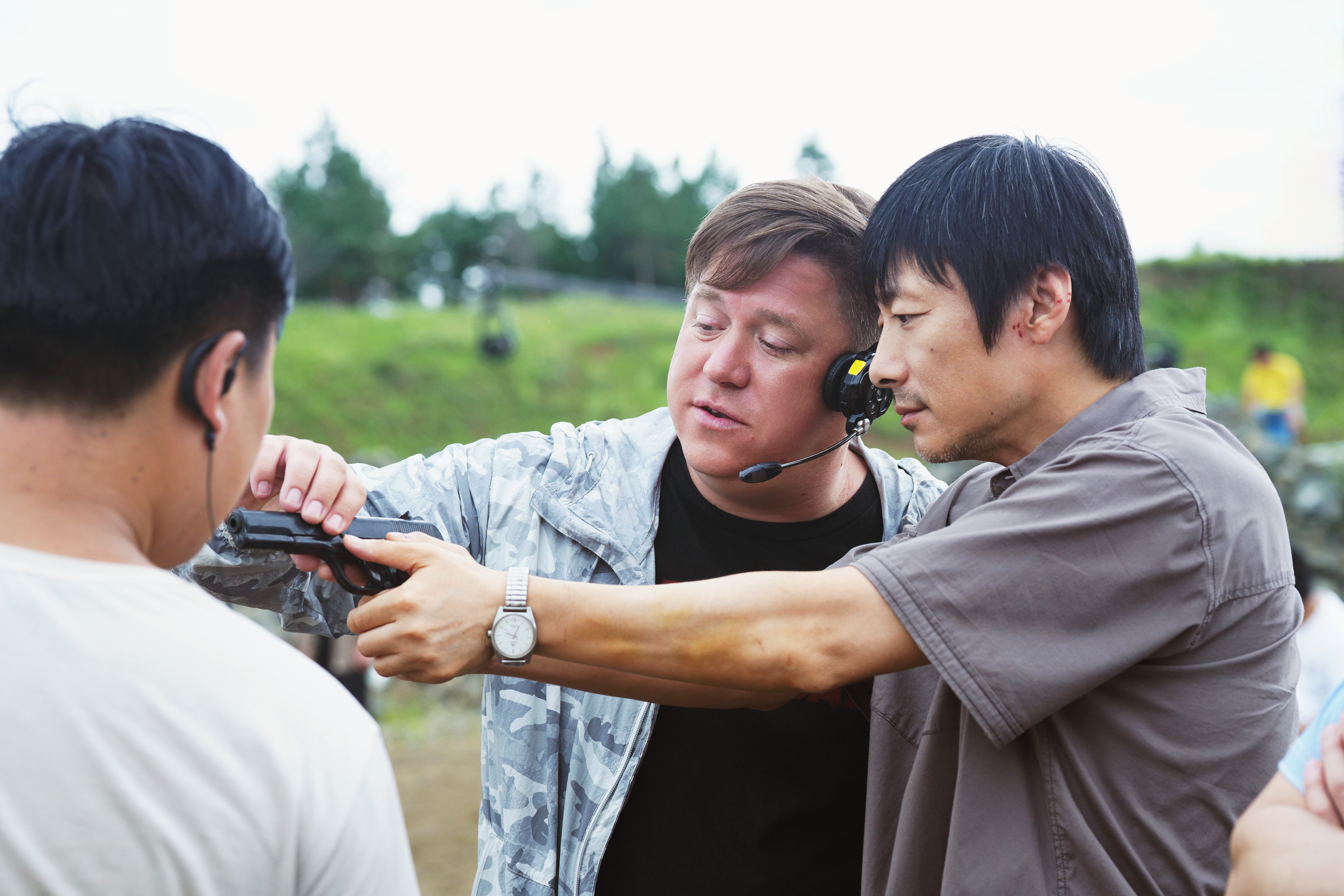 祖峰(右)和剧组枪械师探讨持枪姿势