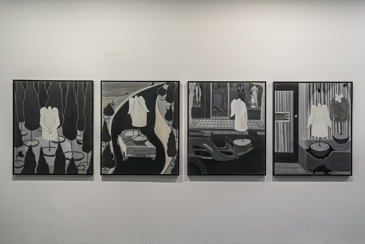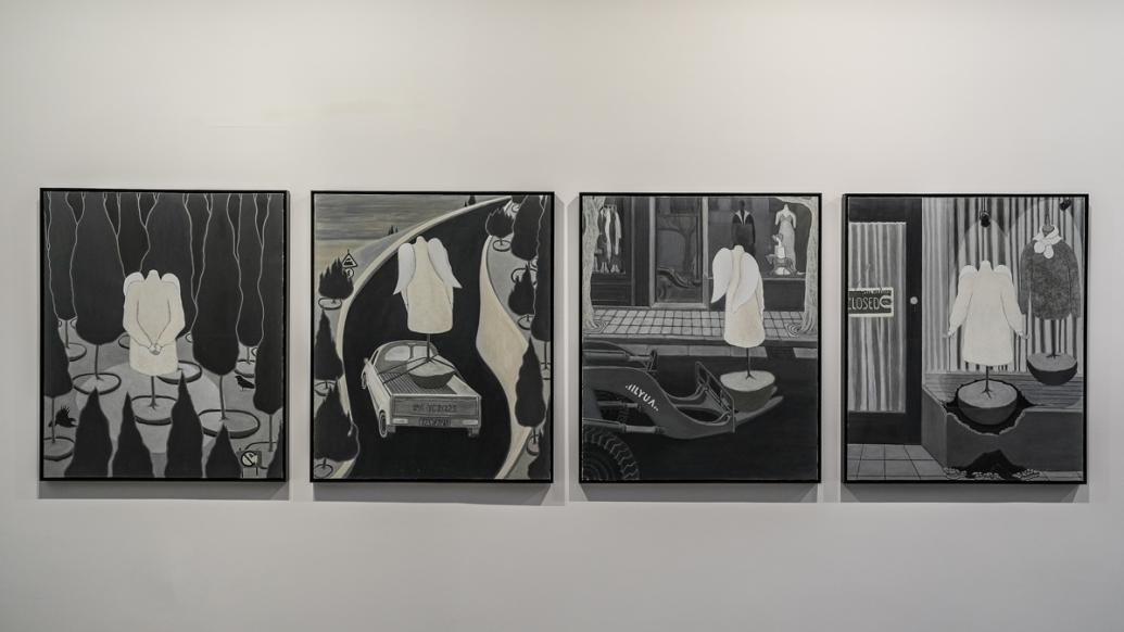 从左往右看:第一幅图中,森林里有一个天使,像一棵树一样准备迁徙;第二幅图是天使在盘山公路上;第三幅图里,天使来到了开了很多商店的上海小马路;第四幅图里,天使被种进了一个小橱窗,成为展示服装的人台。