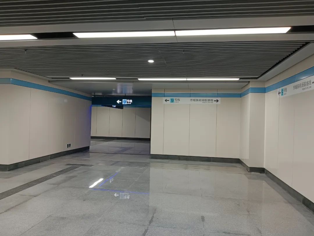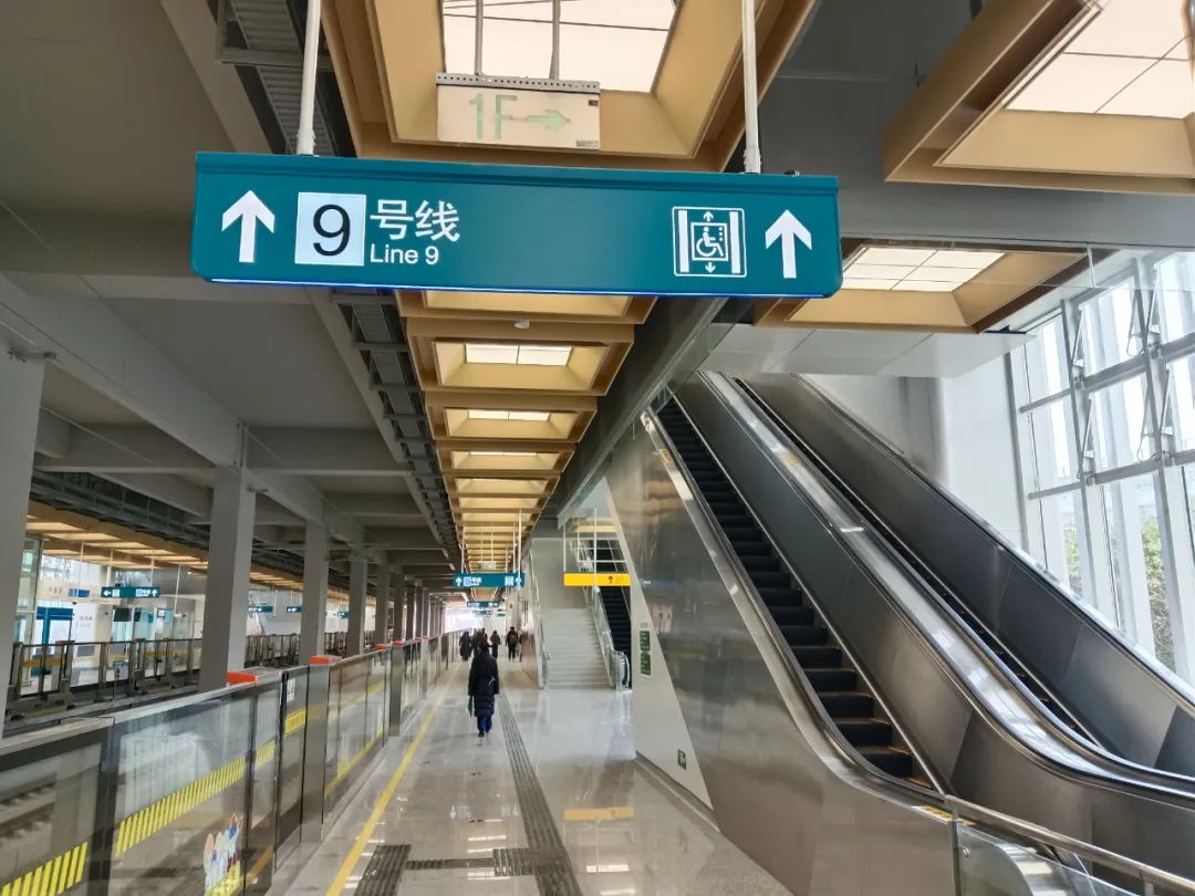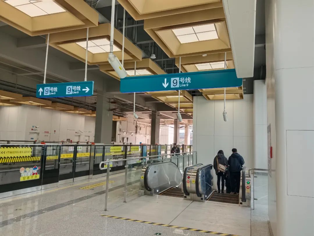 从站台乘坐扶梯向下,可通过站内换乘通道前往9号线