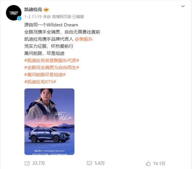 1月3日,美国汽车品牌凯迪拉克官方微博宣布了樊振东成为其品牌代言人的消息:“源自同一个Wildest Dream,全路况携手全满贯,自由无畏勇往直前;凯迪拉克携手品牌代言人@樊振东凭实力征服,怀热爱前行。莫问前路,尽是坦途。”