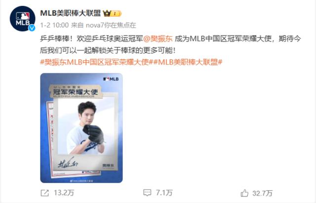 1月2日,MLB美职棒大联盟官方微博宣布樊振东成为其中国区冠军荣耀大使:“乒乒棒棒!欢迎乒乓球奥运冠军@樊振东成为MLB中国区冠军荣耀大使,期待今后我们可以一起解锁关于棒球的更多可能!”