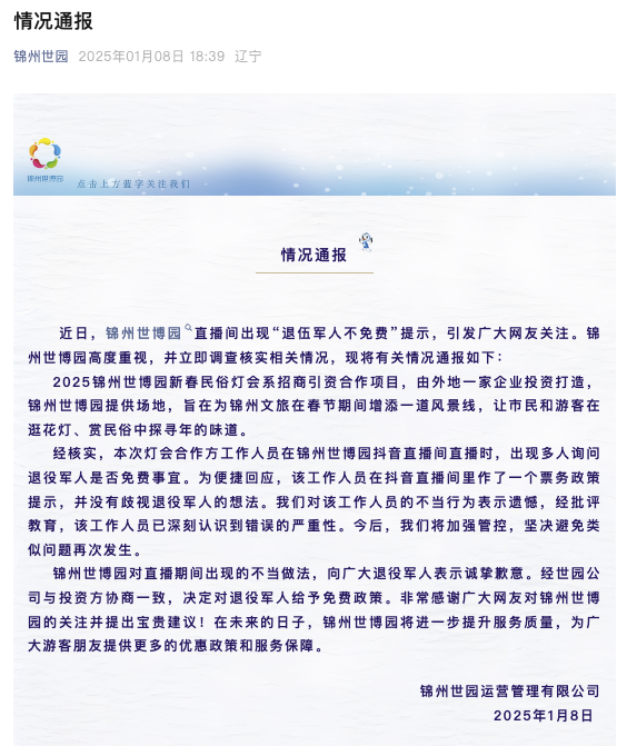近日,锦州世博园直播间出现“退伍军人不免费”提示,引发广大网友关注。锦州世博园高度重视,并立即调查核实相关情况,现将有关情况通报如下: