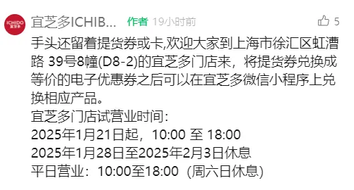 宜芝多称,欢迎大家到上海市徐汇区虹漕路39号8幢(D8-2)的宜芝多门店来,将提货券兑换成等价的电子优惠券之后可以在宜芝多微信小程序上兑换相应产品。