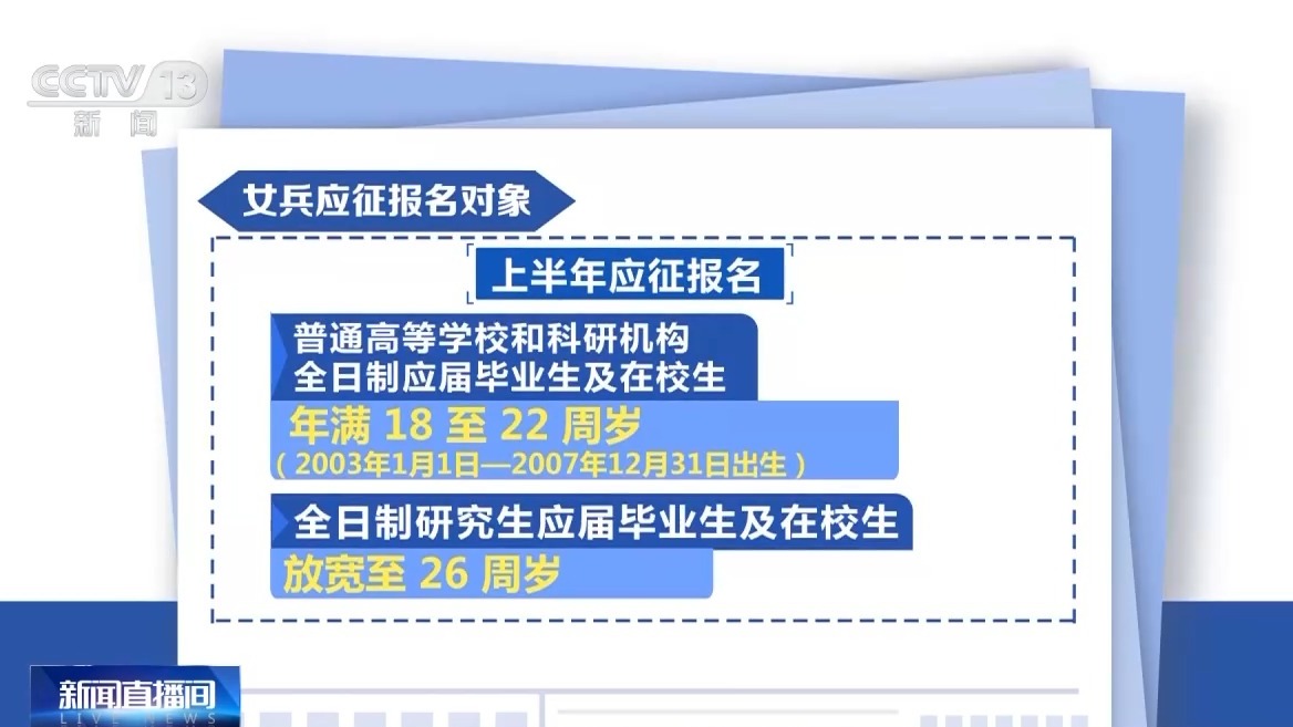 女青年为2025年年满18至22周岁,全日制研究生应届毕业生及在校生放宽至26周岁,上半年征集的2024年普通高等学校全日制本专科应届毕业生放宽至23周岁。
