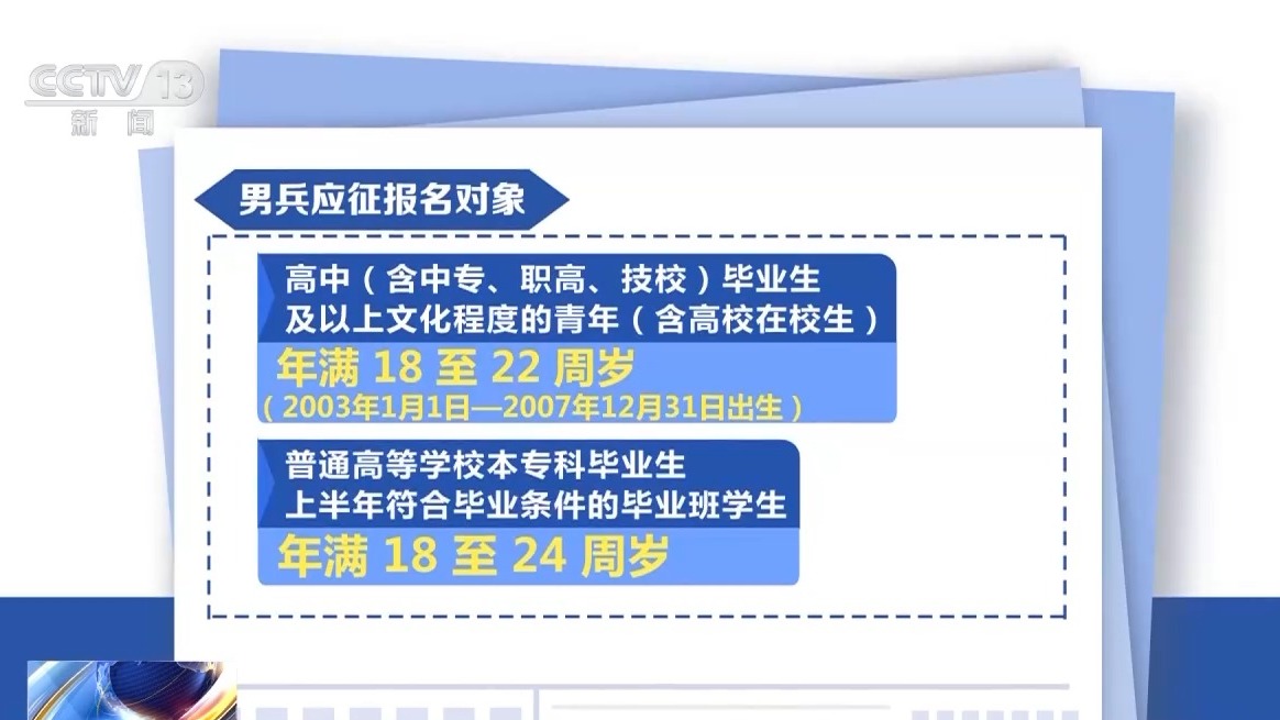 2025年上半年征兵体检、审核工作从昨天(15日)开始全面启动,至3月31日结束。《中华人民共和国兵役法》规定,每年12月31日以前年满十八周岁的男性公民,都应当按照兵役机关的安排在当年进行初次兵役登记。今年征兵有哪些政策要求,对年龄条件有哪些限制?我们一起来了解。