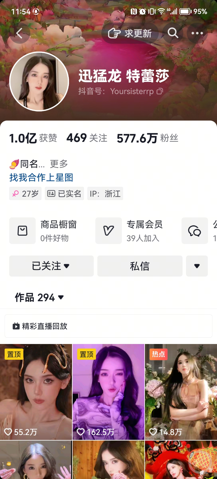 上游新闻记者2月26日在“迅猛龙 特蕾莎”抖音账号发现,目前她的粉丝量为577.6万,获赞量为1.0亿,群聊为1个,发布的作品为294个。据媒体报道,其因长相艳丽、声音甜美走红,“迅猛龙 特蕾莎”被网友称为“厦门林志玲”。