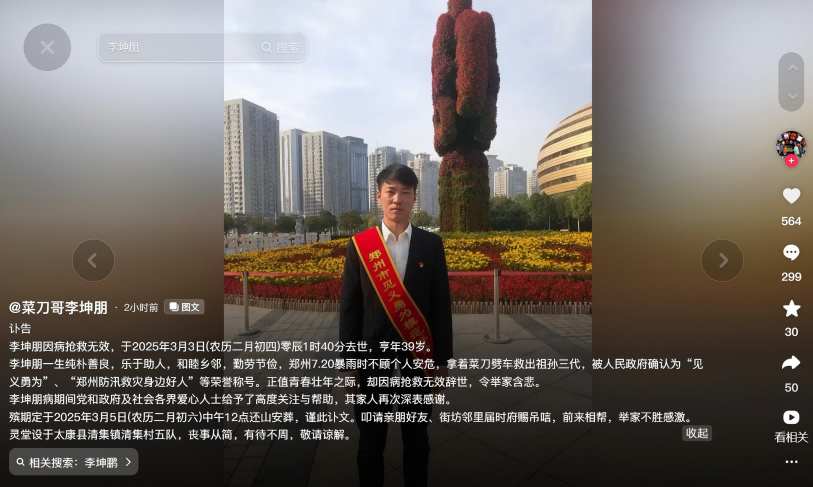 39岁“菜刀哥”李坤朋因病去世,曾在“7.20暴雨”中救出三人