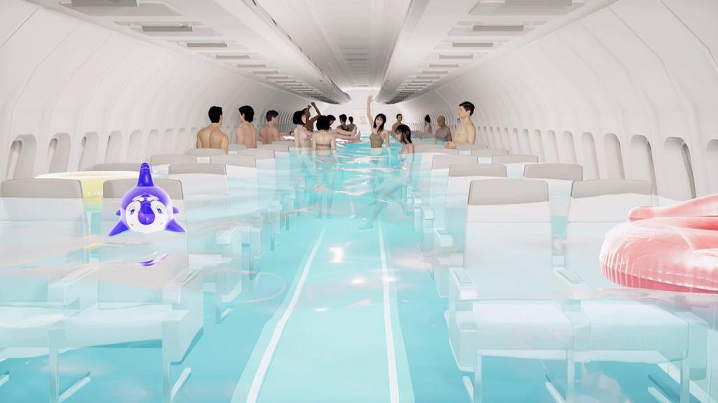 所以可能是两种关于环境的焦虑感重叠在一起,我当时做了一件作品,叫做《很快就会够深了》,它是一群人在一个飞机舱里举行一个类似泳池派对的场景,但这个飞机里面不断有水慢慢往上升,一开始感觉像是一个泳池,但水越来越深,最终淹没了整个飞机舱。这个兴趣应该是从那个时候开始的。
