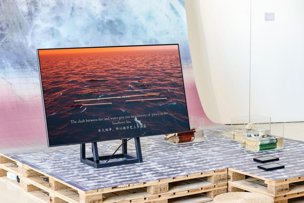 《碎波上的星光行》是胡芮受广东时代美术馆展览《岛亦有道》委任创作的作品,初看并不显眼。作品的主体部分是一个20分钟不到的视频故事,描绘了一个虚构的未来华南沿海城市“南港”通过开发和建造水上社区来应对沉没危机的场景。作品将现代房地产开发与华南海盗的故事交织,反思开发与生态危机中的权力博弈。今年2月这件作品在上海展出。在我看来,它已具备一部气候小说的轮廓。我通过胡芮的个人主页联系上了他,得知他今年刚刚入职昆山杜克大学,从广州搬到了昆山。