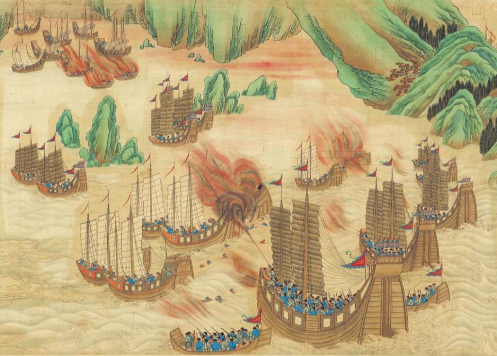 《靖海全图》描绘了嘉庆年间清总督百龄奉旨平定海盗、张保仔归顺清廷的故事,图为“火攻盗艘”。