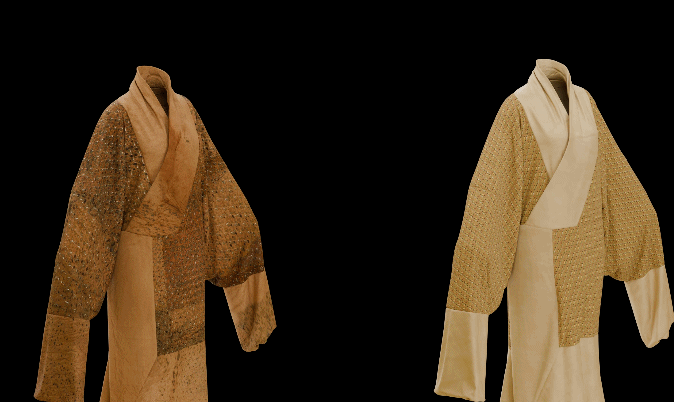 湖南博物院数据中心主任何也介绍,基于对文物本体超高清数据采集工作,协同创新团队采用数字化建模、搭建AI辅助工具等技术手段,做出两件“赭黄色纱地印花敷彩丝绵袍”数字孪生模型,一件还原出印花敷彩丝绵袍两千多年前的“新衣”状态,另外一件仿制文物出土之后、保存至今的“旧衣”状态。