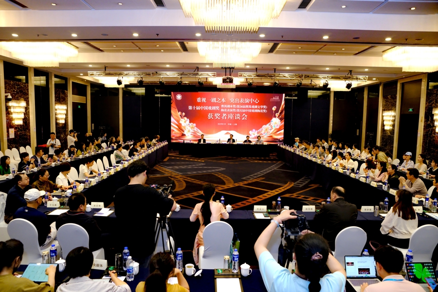 昨日上午,第十届中国戏剧奖获奖者座谈会在上海银星皇冠假日酒店金爵厅召开。座谈会以“重视一剧之本,突出表演中心”为主题,前一晚刚斩获梅花奖与曹禺戏剧文学奖的15位演员、5位剧作家齐聚一堂,谈成就,更谈问题,围绕当下戏剧创作的文学根基与舞台表演中的种种现象疏堵点、击痛点,赤诚相待,畅所欲言,共话戏剧未来。