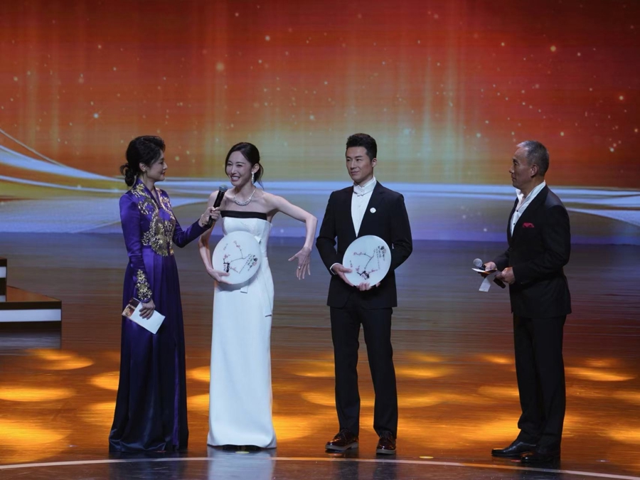 梅花奖颁奖现场,朱洁静(左二)谈及朱鹮喜笑颜开
