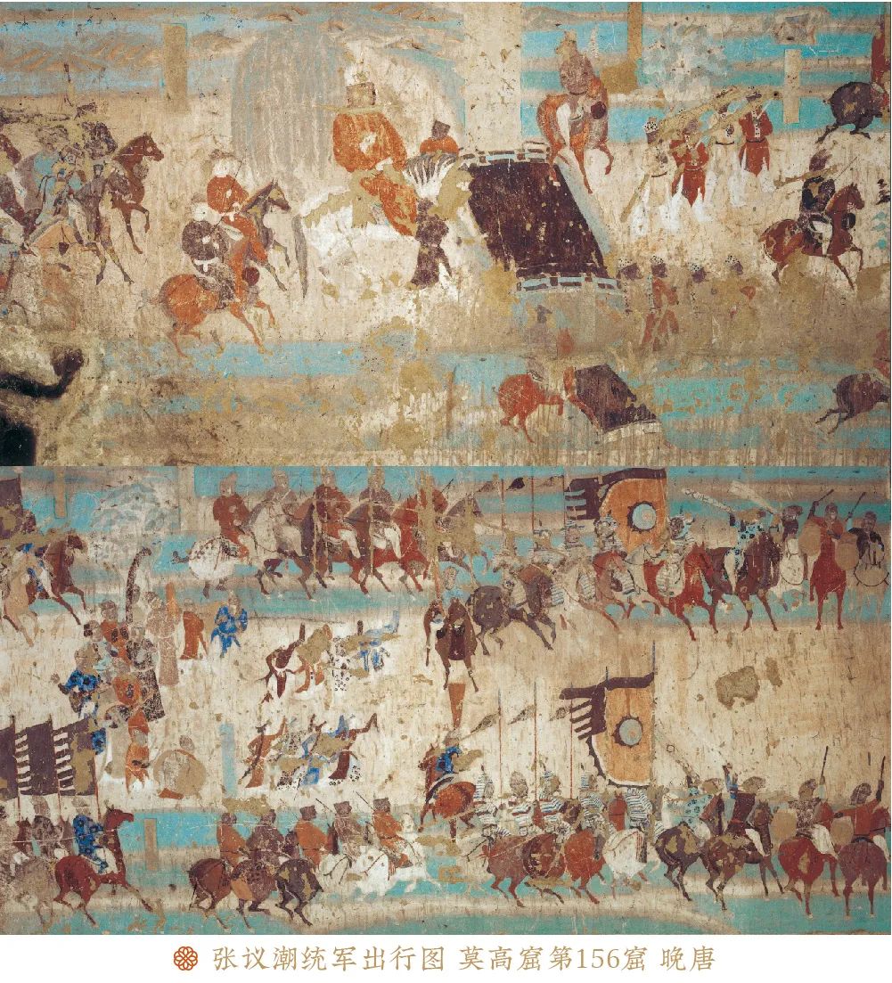 《张议潮统军出行图》是敦煌莫高窟第156窟的著名壁画,创作于晚唐时期(约公元848—公元907年),属于敦煌石窟中规模宏大、艺术精湛的“出行图”系列之一。这幅壁画生动描绘了归义军节度使张议潮率军出行的场景,兼具历史纪实性与艺术价值,是研究唐代军事、服饰、仪仗及敦煌历史的重要图像资料。