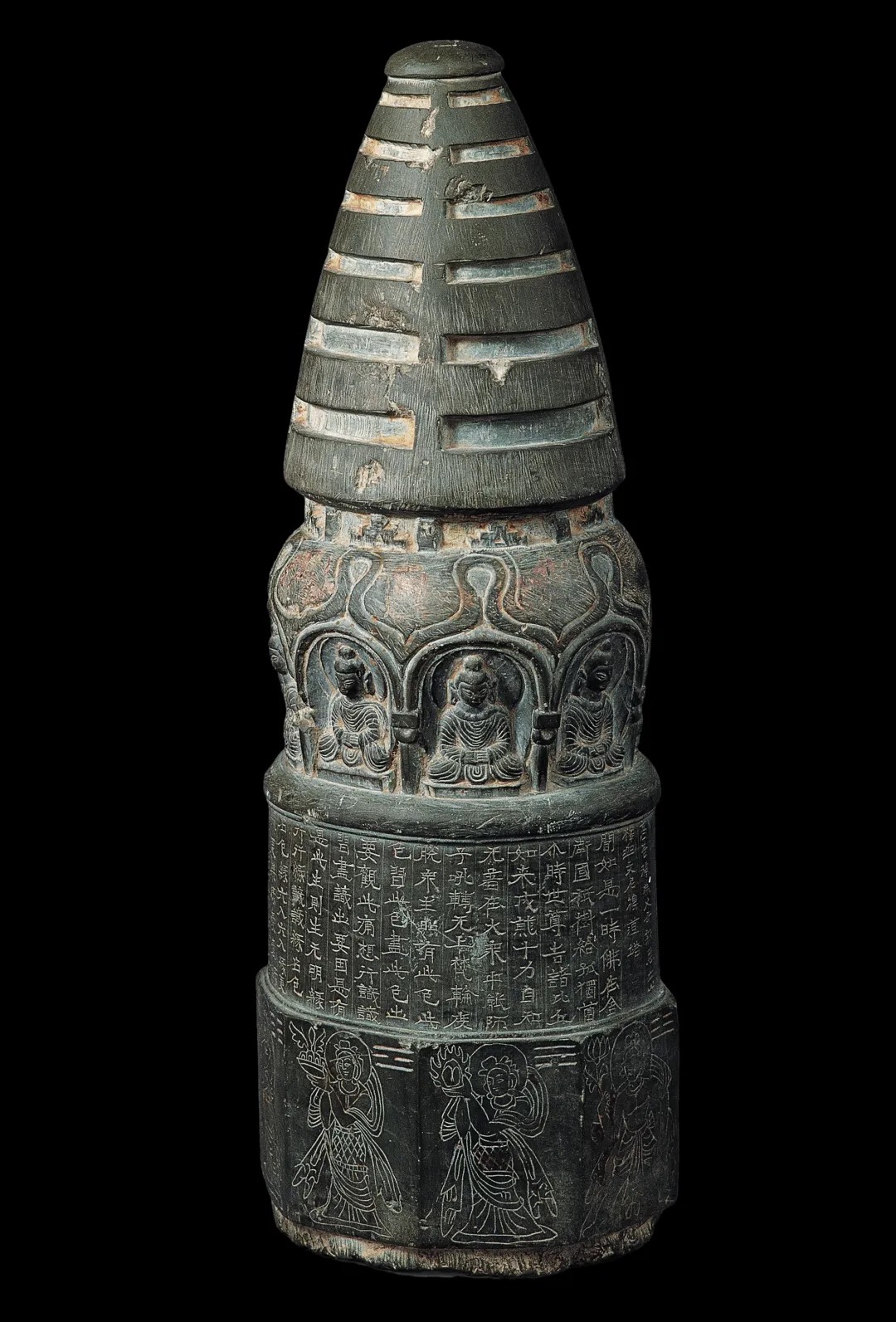 高善穆石造像塔是甘肃省博物馆收藏的十六国时期北凉佛教文物,造于承玄元年(428年)。堪称佛教艺术东渐中的丝路遗珍。石塔通高44.6厘米,底径15.2厘米,黑色玄武岩光亮如新。