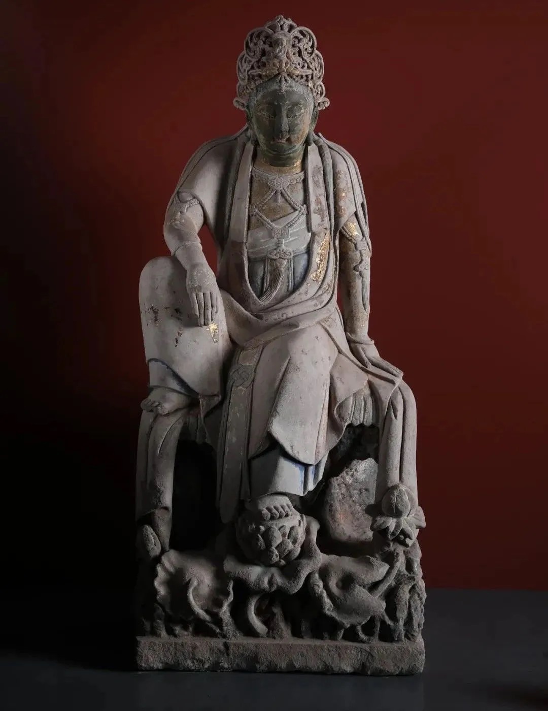 彩绘贴金石刻水月观音坐像 宋