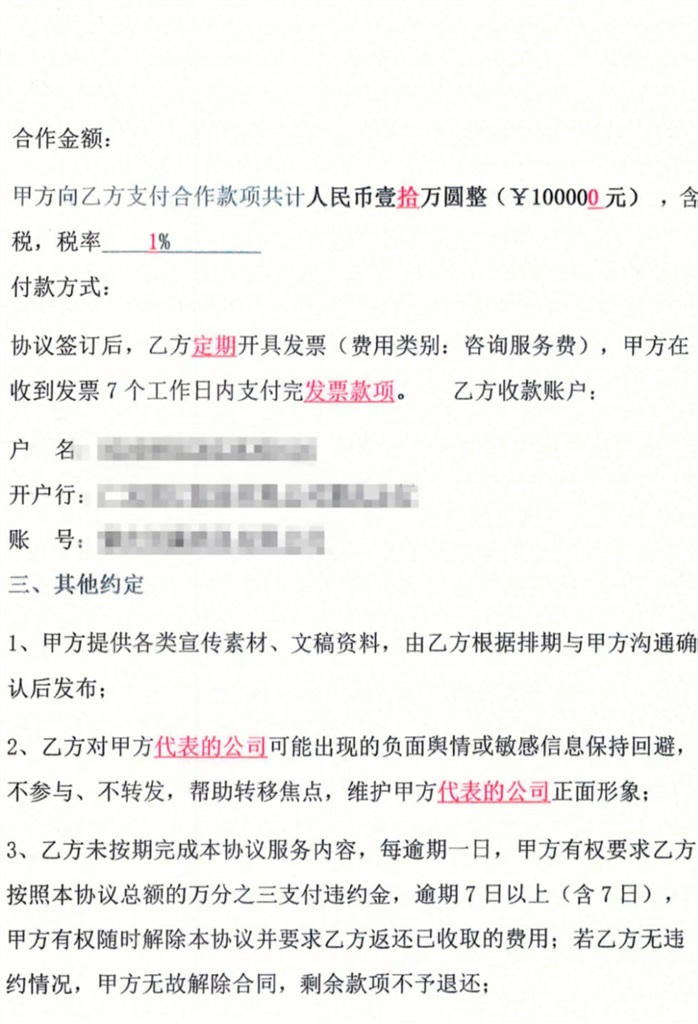 丁某通常选择在行业关键节点或利用特定社会热点,高频次、持续性发布这些负面、不实文章,严重损害企业商誉,以此迫使企业签订所谓的“市场推广合同”,支付大额服务费用。合同金额被丁某精心设计在每年2万至10万元人民币不等,具体数额根据企业规模、行业地位及经其评估的“承受能力”而定。