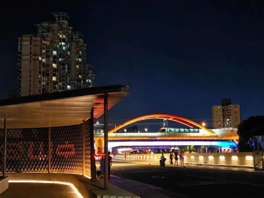 与城市的历史人文同样迷人的,还有华灯初上的河畔夜景。当夜幕降临,这场漫游也迎来了最浪漫的收官!沿着长宁路与苏州河沿线的长宁健身步道行走,你可以穿过焕新后的中山公园、路过夜色中的“七彩虹桥”凯旋路桥,还可以看到拥有滨水特色的“律动夜景”虹桥河滨公园,欣赏光影与绿地、河流交织的休闲氛围。